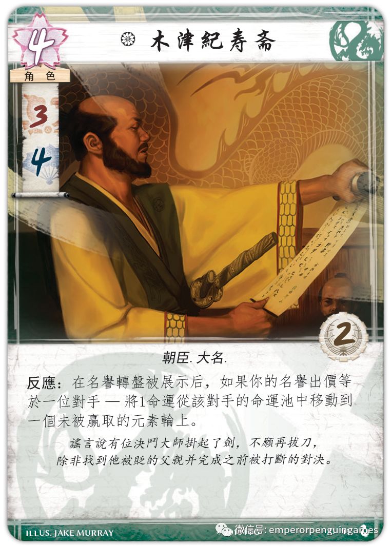 比起中间信江防止对手牌的破坏,木津纪寿斋(朝堂大师,15)能防止对手干扰的能力更加微妙,通过减少对手的命运来减少对手的选项。如果你和对手在一次名誉出价当中展示了相同的数值,那么你就可以将其命运池中的一个命运移到一个未被赢取的元素轮上。如果你是先手玩家,那么你可以将这个命运放到你首次冲突想要宣告的轮上马上获取,又或者把命运放到对手不需要的元素轮上,逼迫他们作出次优的选项。