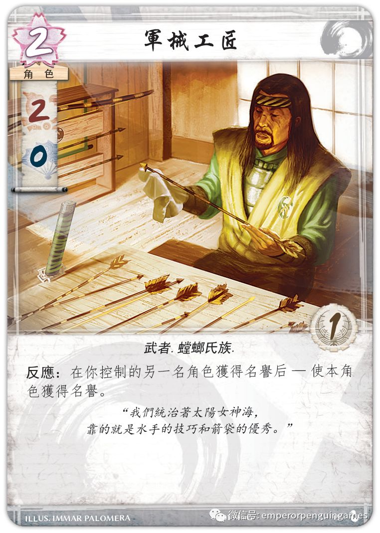 并非朝堂大师扩展中的非仙鹤氏族卡牌都是针对仙鹤的。虽然近来螳螂和仙鹤有所不和,但军械工匠(朝堂大师,19)可以成为帝国左手可靠的盟友。在其他友方角色获得名誉后,工匠可以载誉他自己,成为很适合仙鹤氏族的一个军事助力,而这正是仙鹤所需要的。有了像仙鹤之道(核心包,146)这样的卡牌,工匠这样的2费角色很容易就能成为一个3点军事值的力量。