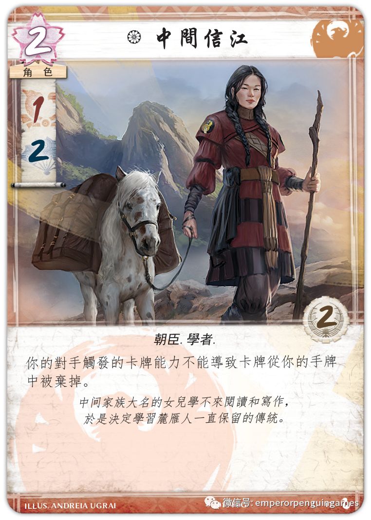 中间信江(朝堂大师,17)是一位凤凰氏族的学者,他制止一场政治辩论(追名逐誉,40)。只要这位朝臣在场,你的对手就不能让你弃置手牌。这就意味着你手牌中宝贵的冲突牌将永远安全,不会受到优雅典范(帝国的子民,13)这样角色的破坏。作为有着两荣耀值的角色,中间信江在载誉后也能在冲突中成为凤凰氏族的一个强大战力。