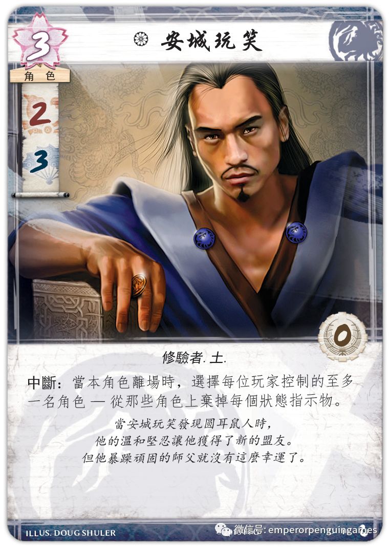 仙鹤是极其强调荣耀和名誉的一个氏族,而巨蟹对此颇为不屑,认为没有必要为了荣耀付出那么多,安城玩笑(朝堂大师,14)对巨蟹的哲理贯彻到底,他不仅没有荣耀,并且在离场时可以移除每名玩家控制的一个角色的状态指示物。这不仅可以对抗仙鹤大量载誉角色的威胁,还能移除你自己角色上的毁誉指示物!巨蟹有着无数送走他们勇士的方式。当安城玩笑的命运耗尽时,他总能找到一个目标,让巨蟹与他的敌人能够回到同等的水平上。
