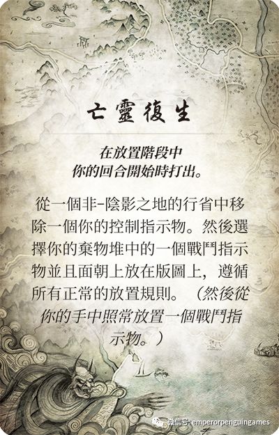 如果你控制了阴影之地的一个省份,你会如常获得领地卡。不过不像其他翡翠帝国的区域,这些阴影之地的领地卡并不是在维持阶段使用。相反,这些领地卡是在控制玩家的放置阶段开始时使用。如果你控制的是阴影之地的北边,那片被巨蟹氏族领土环绕的地区,那么你可以选择复活死者并将其加入你的军队。通过使用这一能力,你可以从一个非阴影之地行省上移除一个控制指示物并将其替换为你弃物堆中的一个战斗指示物。接下来你如常从你手中放置战斗指示物。