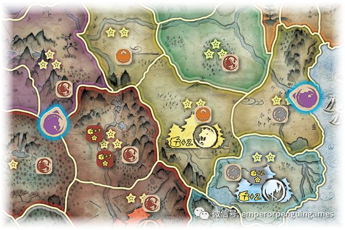 在上面示例中,奇麟氏族的勇士们是浪人。在放置阶段中,他们可以在任意边界放置指示物。在这个例子中,它们试图攻击被毒蠍和巨蟹氏族控制的行省。如果毒蠍或巨蟹氏族让自己的省份无人防御,或者如果它们放置的战斗指示物在翻开结算时被超过,那么奇麟氏族将控制那片区域并不再是浪人。他们在氏族间火热的冲突中重新登场了,不过他们是否能将胜利带给他们的氏族则还在命运的手中。