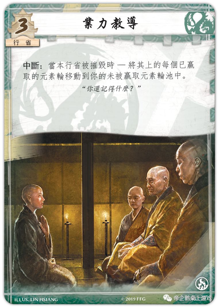 氏族战争扩展包当中很多新的卡牌都能与行省上赢取的元素轮进行交互。需要注意的是,这些卡牌的能力仅在觉悟模式中生效,并且无法影响争夺中的元素轮。例如,樋田守密人(氏族战争, 25)是你在防御带有元素轮的行省时希望能够使用的武士。除此之外,潜龙的新行省业力教导 (氏族战争, 15)可以减轻一次重大失败带来的后果,在其被击破的时候,你可以将上面的元素轮转移到其他安全的位置,这有可能就是制止对手获胜的关键机会。