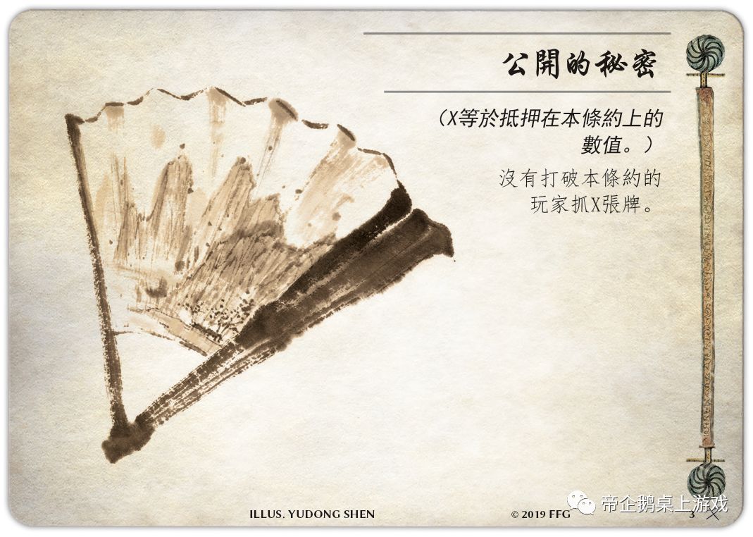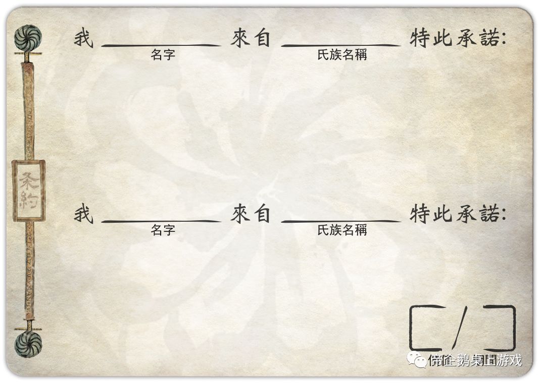 氏族战争也引入了一种新的卡牌类型:条约卡。这些牌给觉悟游戏中条约的使用带来了更具活力和不可预测的游戏体验,当然条约卡是可选项。你只需要在签订条约时随机选择一张条约卡,并将名誉值放在上面。当一个条约被打破时,违反条约的玩家会展示这张卡并处理其上的文本。例如,公开的秘密 (氏族战争, 3) 允许被背叛的玩家在条约被破坏时抽取等同于条约价值的卡牌。