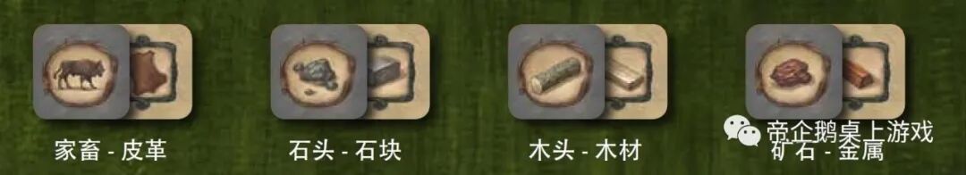 游戏中共有四种资源,但每种资源又分为原料和精炼两种级别,分别是家畜对应皮革,石头对应石块,木头对应木材,矿石对应金属。原料较容易采集,而制作工具主要需要精炼资源,转化原料为精炼资源的时机和效率都很重要,在被其他玩家掠夺时交出原料,制作工具时再使用工匠将所需资源精炼,实现资源利用最大化。