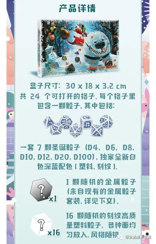 作为一款节日限定产品。它不仅是购买一套用来跑团或游玩的骰子而已,还融合了经典的“圣诞日历”玩法,为圣诞节倒计时增加了另一种乐趣和体验。