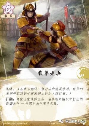集结。(在本卡牌于一个行省中被展示后,将你的王朝牌组顶的卡牌面朝上的加入该行省。)行动:每位玩家选择至多一名其在本阶段中打出的武者角色 — 使那些角色获得名誉。
