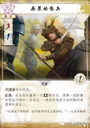 “无畏的散兵”的能力点数比较平庸,其能力可以移动毁誉状态指示物,这可以有力地抗击毁誉牌组。(MZMZ:从另一方面说甚至可以与“骄傲”或者“伪造的诏书”形成配合。)