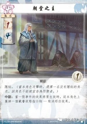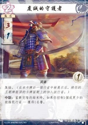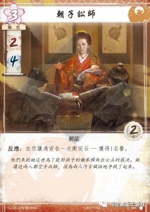 名誉之声可以说是仙鹤氏族的标志性卡牌,荣誉贵宾在被禁用前更是各个氏族的噩梦。这张牌并不是名誉贵宾,触发其能力需要先载誉他。由于“朝堂之主”只有一点荣誉值,所以单从能力点数方面考虑,仙鹤玩家没有什么载誉他的动力。如果你触发了“朝堂之主”的能力,你需要马上再次载誉他。这使得你可能失去了载誉其他角色或者触发名誉之声的机会。这张牌很像是设计组将名誉贵宾重做后的版本。(MZMZ:我更喜欢这种迫使玩家做出抉择的设计,朝堂之主让玩家必须在:1.载誉朝堂之主从而可以反击对手事件和2.载誉其他高荣誉值角色,获得更直接的战力中做出选择)