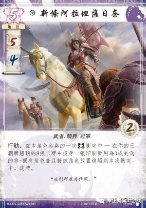 集结。(在本卡牌于一个行省中被展示后,将你的王朝牌组顶的卡牌面朝上的加入该行省。)中断:当本角色离场时,如果你的名誉比一位对手少 — 获得2名誉。