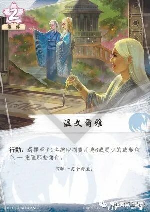 重置效果一般都非常强力,重置效果的卡牌费用一般是1。“温文尔雅”的费用是2,但可以重置两名载誉角色。这一效果有好有坏:好处是这张牌效率很高,其上限能重置两名载誉角色。由于载誉角色的能力值一般都很高,重置两个载誉角色将会对当前冲突阶段产生巨大影响;坏处是这张牌非常笨重,如果你只有1命运或者只控制一个载誉角色,“温文尔雅”就显得非常尴尬。