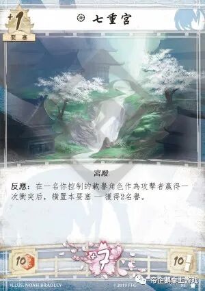 第一眼看到这张牌,我们很容易会想到25名誉获胜。你用七重宫的能力或因载誉角色离场而再获得15点名誉即可获胜。从另一方面讲,七重宫会打消对手压制你名誉的战略,其带来的大量名誉让你大可放心地使用刺杀或其他需要支付名誉的卡牌。