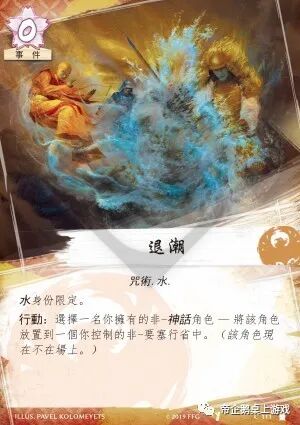 水身份限定。行动:选择一名你拥有的非-神话角色 — 将该角色放置到一个你控制的非-要塞行省中。(该角色现在不在场上。)