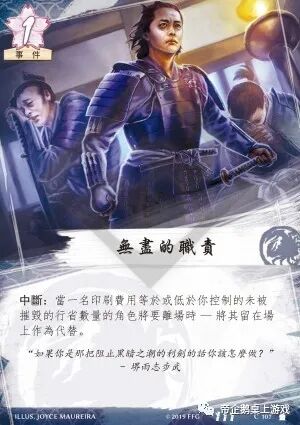 “无尽的职责”是一张事件版的缓刑,其效果与己方未摧毁的行省数有关。一般来说,你会想在第三或第四回合打出“缓刑”,使你的角色再存续一回合。但在那时,你可能会发现已经不能使用“缓刑”来保护你4费用或者5费用的角色了。但是将“无尽的职责”与缓刑和铁矿一起使用仍能使巨蟹氏族不断存续其角色,从而在后期获得优势。甚至你仅用“无尽的职责”来保护一张2费用的角色也是不亏的。