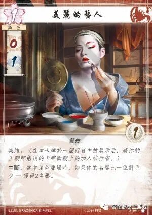 你花了一块钱,得到了一个0点军事能力值,1点政治能力值,1点荣誉值的“艺伎”角色。这看上去完全是浪费钱,还不如直接让过。如果你担心自己的名誉值降的太快,你可以带上这张卡,反正“美丽的艺人”带有“集结”,不会降低你王朝卡组的流动性。