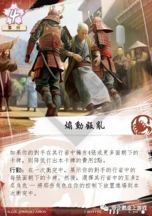 如果你对手的行省上有两张高费角色,那么即使打出“煽动叛乱”需要四费,其效率也非常高。如果对手的行省上有大于等于四张面朝下的牌,你就可以以二费的超低价得到两位角色。不过在冲突阶段,你对手的行省上有四张面朝下的牌并不常见。如果对手控制“金蟾城”(4-1,6),或者在“知事的眼线”(4-1,12)和苍士预言家(4-5,112)的帮助下才可能达成。有趣的是,由于“煽动叛乱”的描述中使用了“展示”一词,所以可以触发“集结”效果,翻开更多的卡牌,使你有更多的选择。此外,在当前有大量带“集结”能力卡牌的环境下,“煽动叛乱”能让对手更快过穿王朝牌堆,从而损失五点名誉。