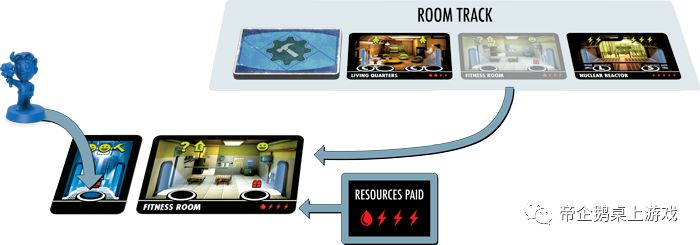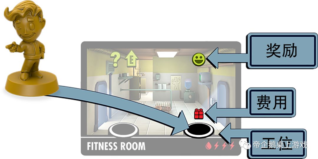 每个房间都有两个工位可以放居民,一些需要费用,但是都会给你一些奖励。在健身房中,把居民放在这个工位,并且支付一个物品,你能得到一个幸福指示物。